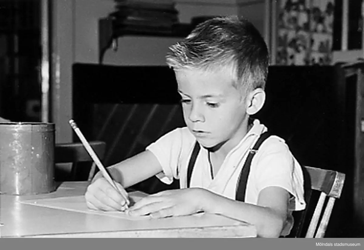 En pojke som ritar vid Holtermanska daghemmet 1953.