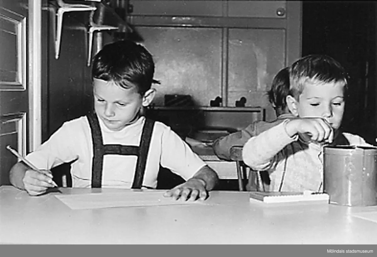 Två pojkar som ritar vid Holtermanska daghemmet 1953.