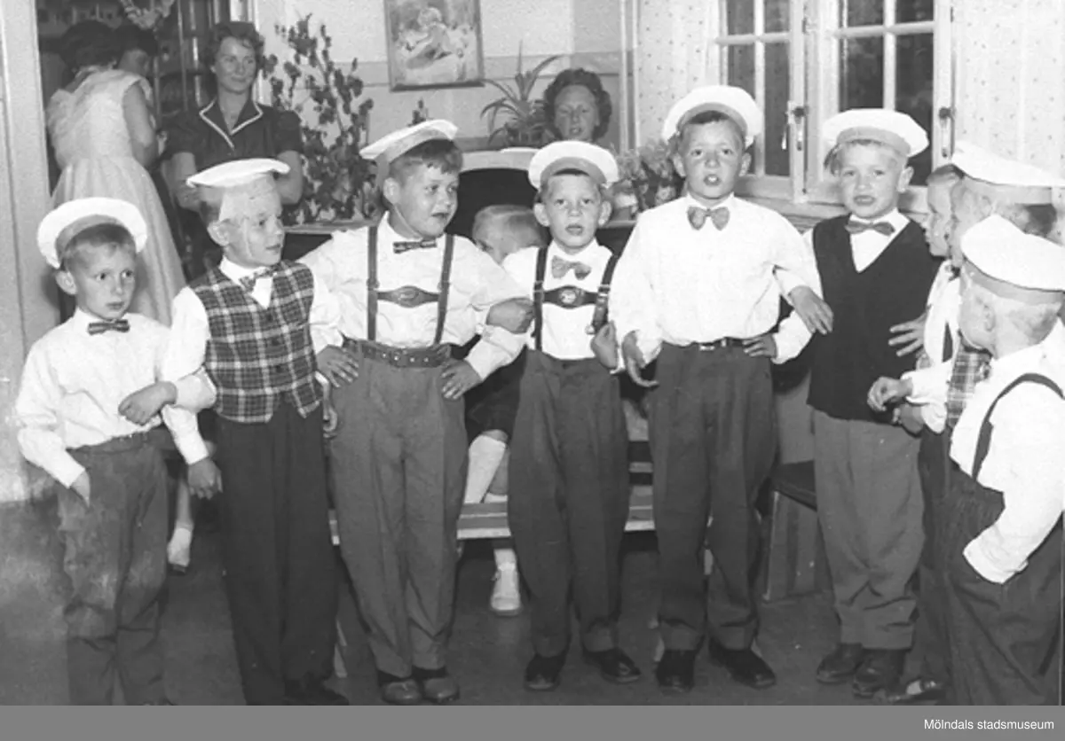 Sånguppvisning av finklädda pojkar med vita mössor, som står arm i arm. Holtermanska daghemmet, okänt årtal.