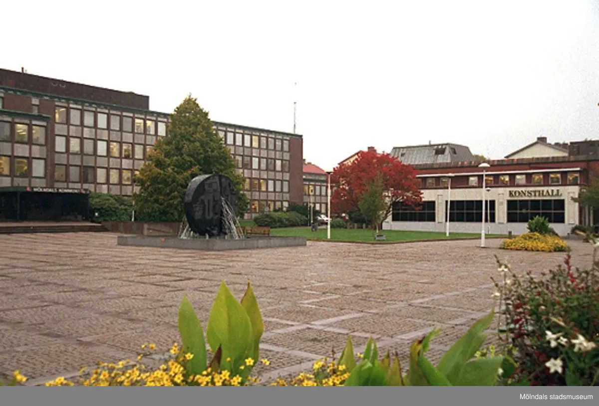 Stadshuset till vänster och konsthallen i Folkets hus till höger. Mölndalsbro i dag - ett skolpedagogiskt dokumentationsprojekt på Mölndals museum under oktober 1996. 1996_1135-1152 är gjorda av högstadieelever från Kvarnbyskolan 9D, grupp 1. Se även 1996_0913-0940, gruppbilder på klasserna 1996_1382-1405 samt bilder från den färdiga utställningen 1996_1358-1381.