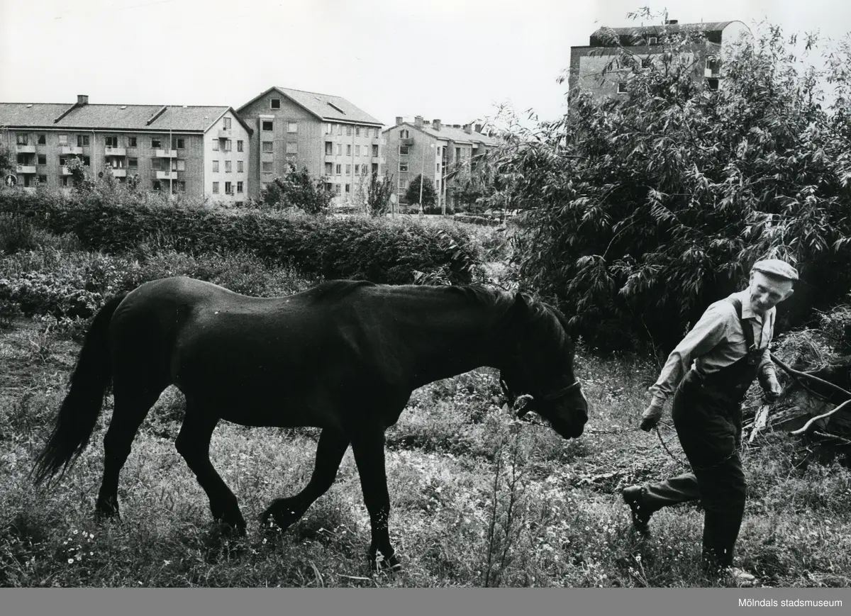 Sten Svanfeldt & hästen Sylvester. Trädgårdsmästeriet på Wallinsgatan. Sylvester sägs vara Sveriges äldsta häst, ca 38 år.
