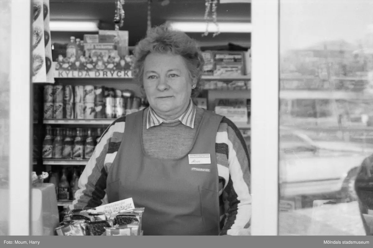 "Alice Jönsson i Pressbyrån vid Lindome station berättade att hon inte var reglementsenligt klädd, men vad skall man göra när kvicksilvret kryper nedåt. Skall man hålla sig frisk och kry i ett sådant draghål som en kiosklucka, måste man ta till någon extra tröja." År 1985.