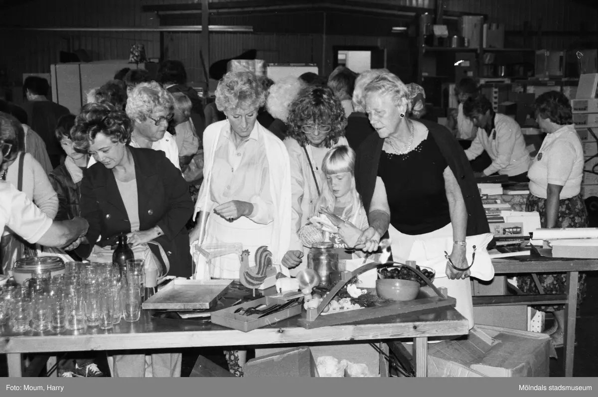 Lindome Lions Club anordnar loppmarknad vid Lindome station, år 1983. "Trångt om saligheten var det när Lions höll loppmarknad vid stationshuset."