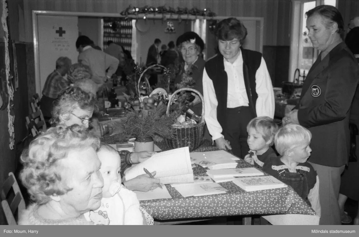 "Gammal och ung trivdes på basaren i Kållered." Röda Korsets julbasar i gamla kommunalhuset i Kållered år 1984.
