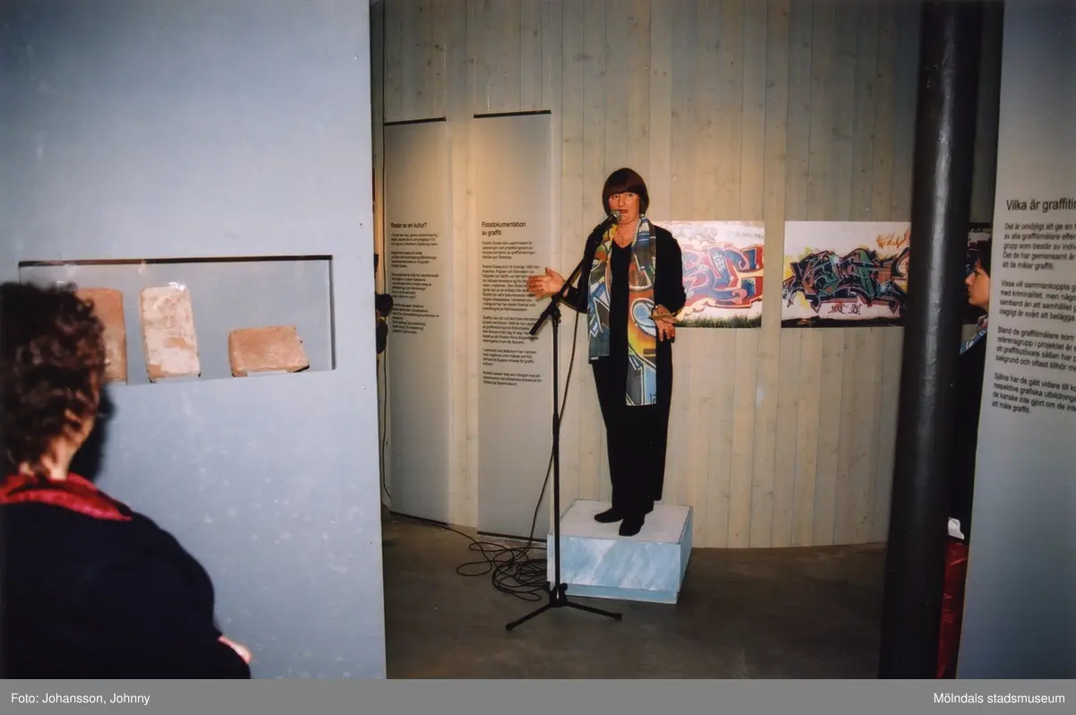 Museichef Mari-Louise Olsson talar vid invigningen av utställningen "Alltså finns jag" på Mölndals museum, år 2003.