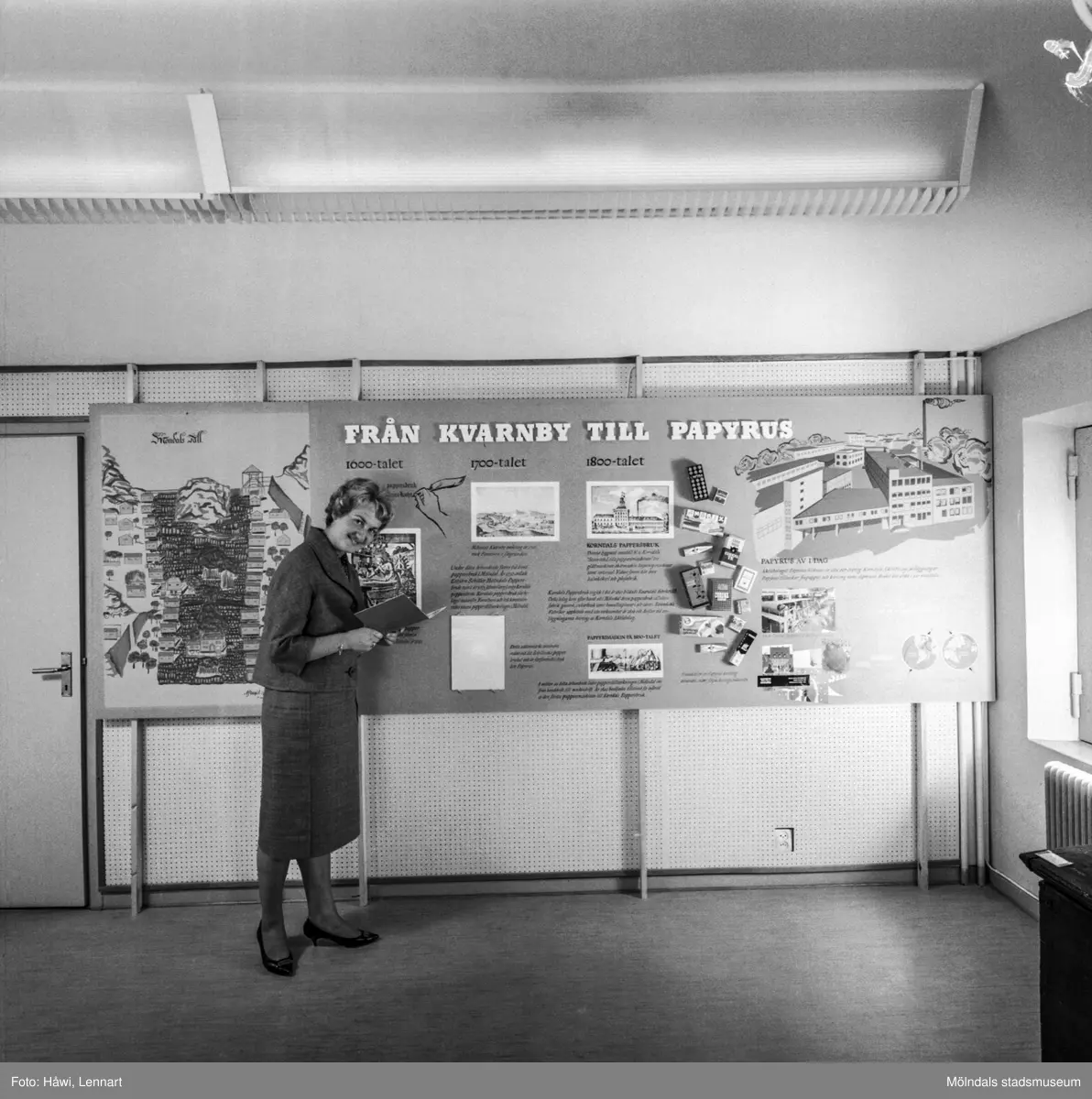 En kvinna står vid montern "FRÅN KVARNBY TILL PAPYRUS" på Kvarnbygården i Mölndal, 14/8 1961.