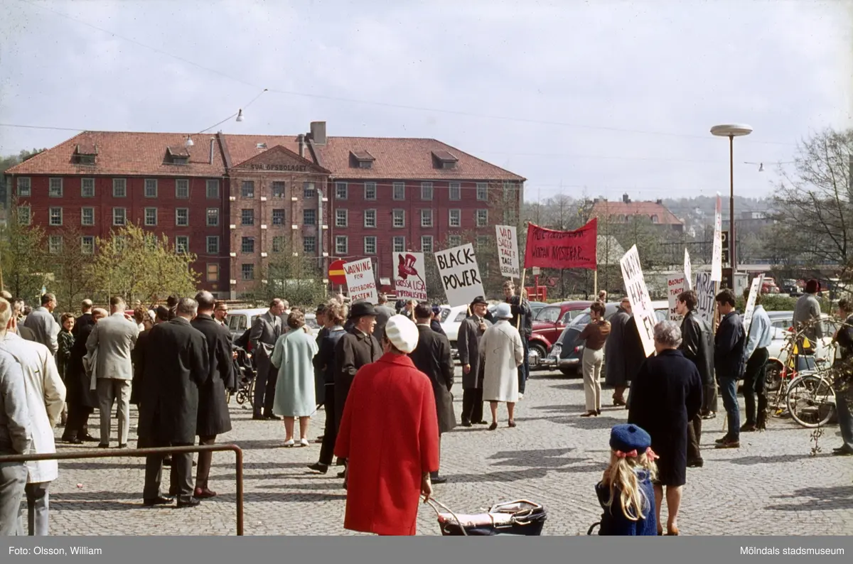 Många personer står samlade på Stadshusplatsen för Black Powerdemonstration, okänt årtal. I bakgrunden, på andra sidan Göteborgsvägen, ses Svalöfsbolaget (Allmänna Svenska utsädesaktiebolaget). Black Power växte fram i USA på 1960-talet.