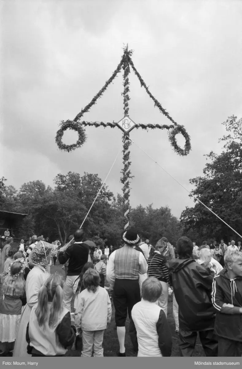 Midsommarfirande på Ekensås i Kållered, år 1984. "Midsommarstången reses efter glada "åhej, åhå", på Ekansås."