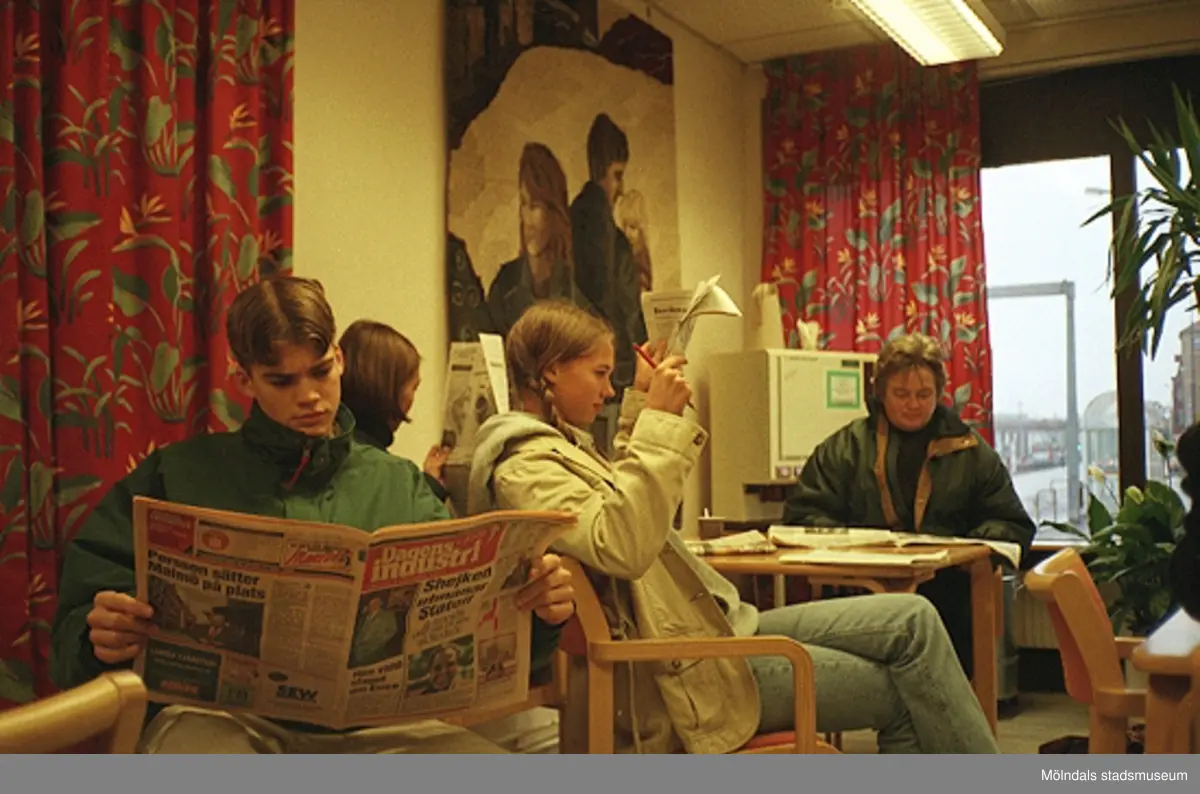 Personer som sitter på stolar och läser tidningar inne på biblioteket. Mölndalsbro i dag - ett skolpedagogiskt dokumentationsprojekt på Mölndals museum under oktober 1996. 1996_1227-1245 är gjorda av högstadieelever från Kvarnbyskolan 9D, grupp 6. Se även 1996_0913-0940.