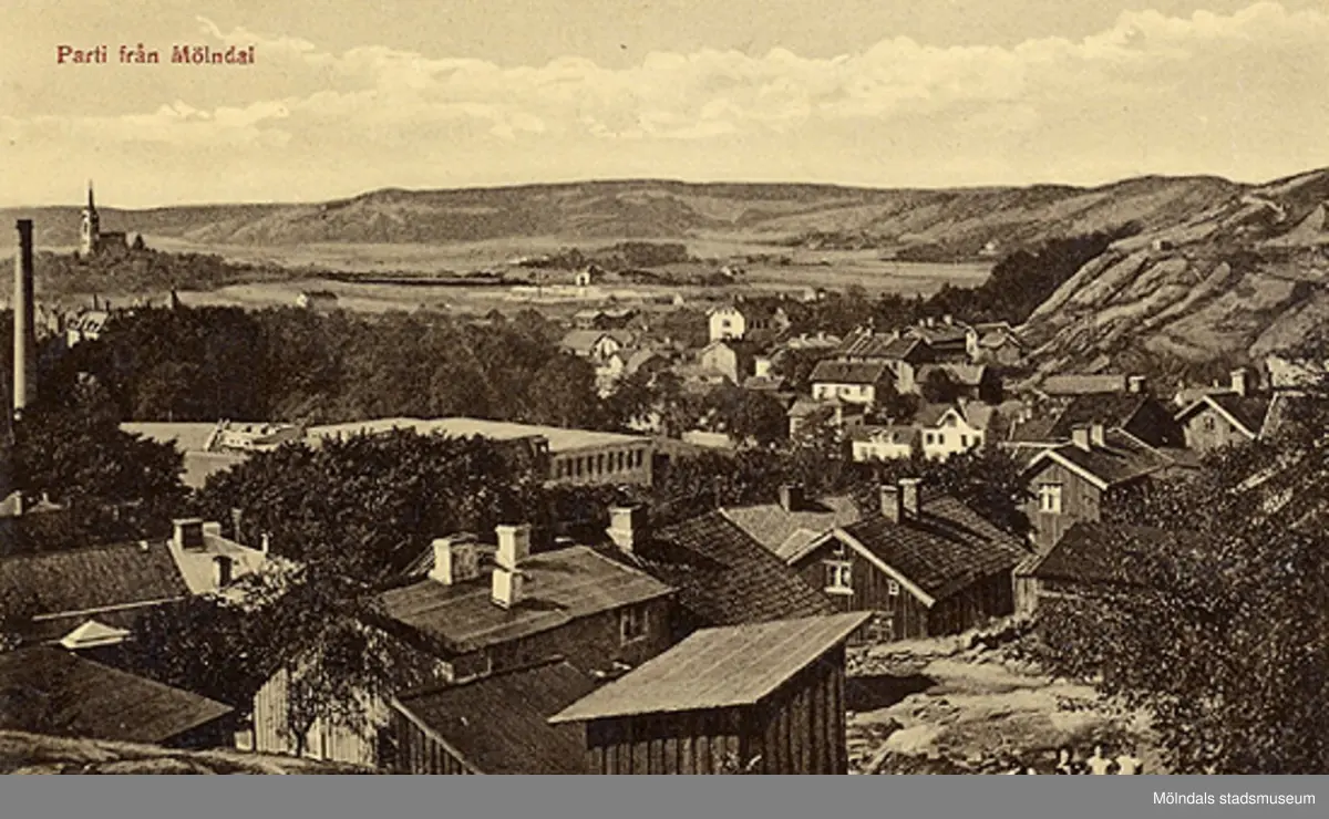 Vykort "Parti från Mölndal" med Roten L (mellan Rygatan och Franckegatan) i förgrunden och Mölndals kyrka till vänster i bakgrunden. Från 1900-talets första årtionden.