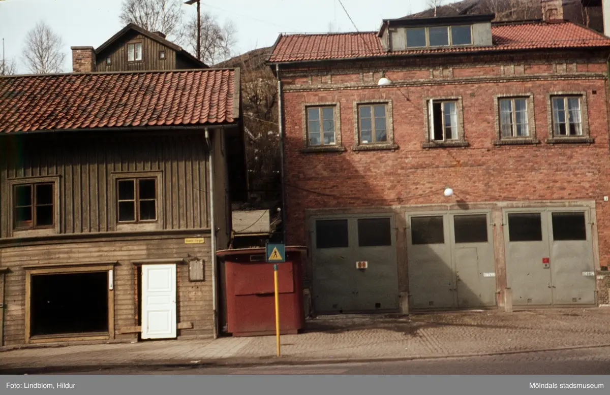 Byggnader vid Gamla Torget i Mölndal, ca 1962. Till vänster ses del av huset Kvarnbygatan 39. Till höger ses huset Kvarnbygatan 41, tidigare brandstation och garage för polisbilar, numera Mölndals målarskola.