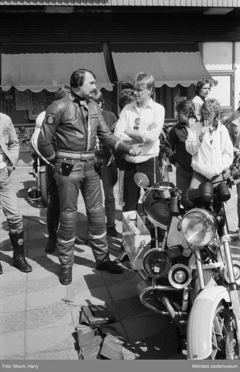Kållereds Motorklubb visar upp motorcyklar i Kållereds centrum, år 1984. "MC-polis Lennart Johansson i samspråk med Mc-klubbens ordförande Dennis Byström."