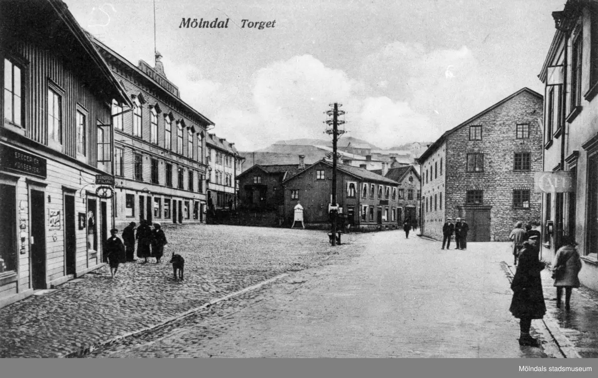 Vykort "Mölndal Torget" med utsikt över torget från väster. Man ser Kvarnbygatan 39 (Nundstedts hus), 43 (kommunala samlingshuset, senare stadshuset), Roten F9 (Hedströms), Kvarnbygatan 45 och 47 (Delbancos stall), Delbancos oljeslageri och Kvarnbygatan 4 (Café, senare även kallad Byggnad 213).