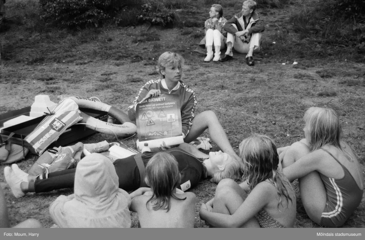 Livräddningsundervisning vid sjön Horsika i Mölndal, år 1984. "Birgitta Wennebäck från Livräddarna lärde barnen viktiga saker."