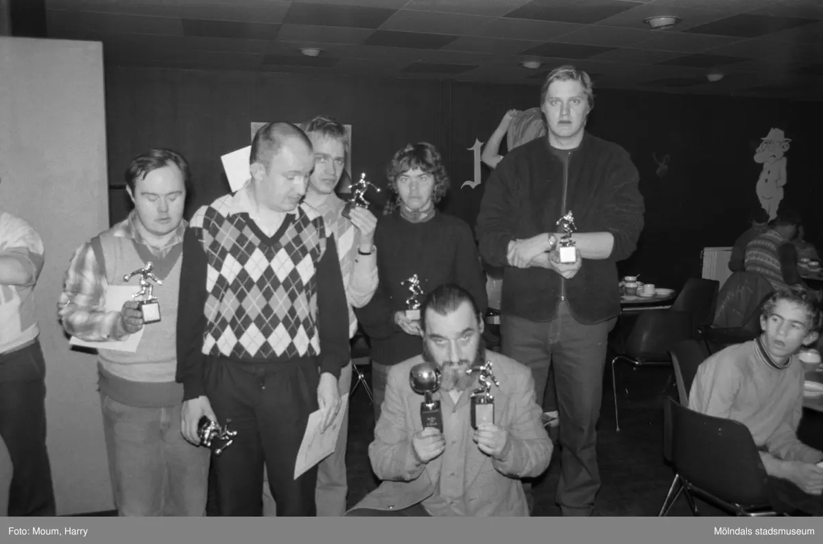 Tävling i bowling för handikappade på Kållereds bowlinghall, år 1984. "Samtliga pristagare fr v: Kenneth Lundin, Bengt Kristiansson, Robert Nordell, Lena Edvardsson, Leif Larsson, Peter Mogren."