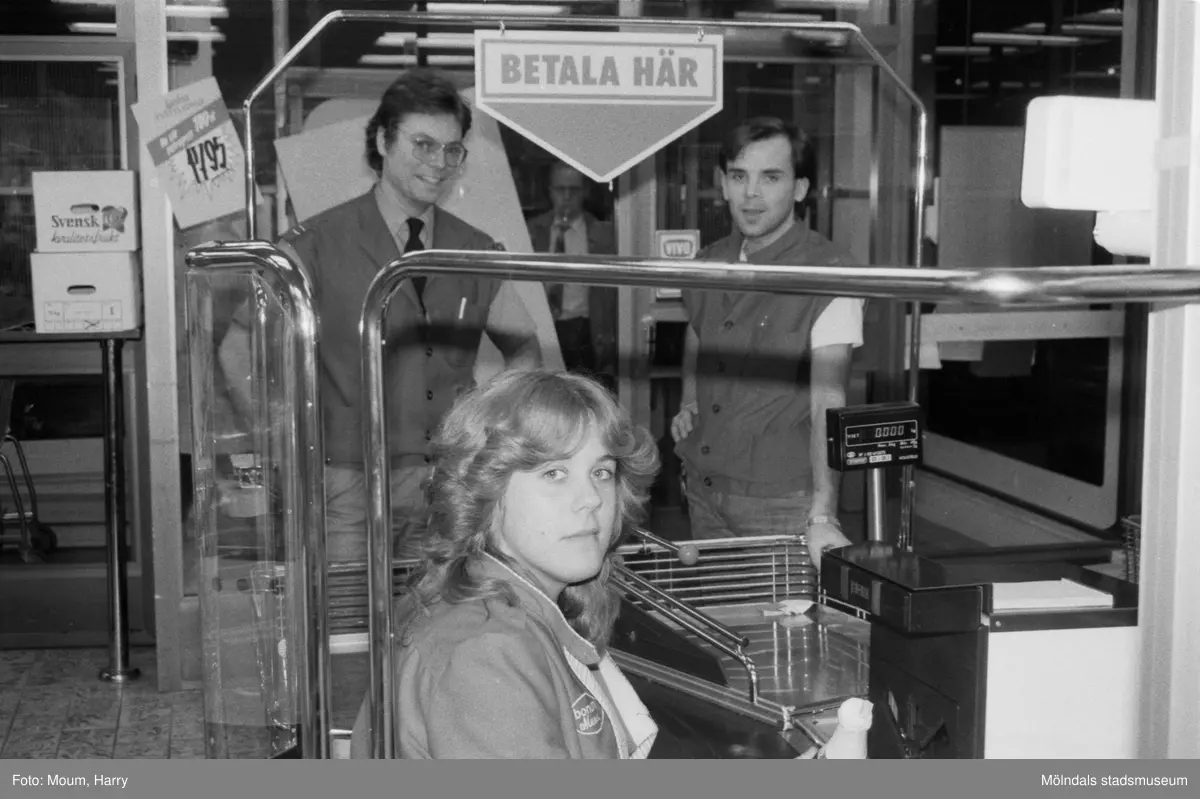 Livsmedelsbutiken Bonum i Kållered installerar datakassor, år 1984. "Kassörskan Maria Andersson demonsterar EAN-systemet för Bengt Kedner och allt-i-allo Janne Lindhult."