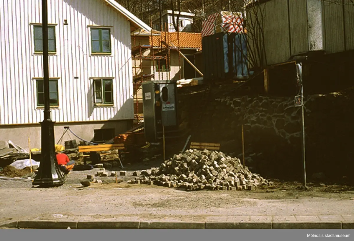 Stensättning vid Lyktplatsen, Norra Forsåkersgatan i Kvarnbyn, april 1993. Den vita fastigheten är Götaforsliden 4 (Korndal 2). Relaterade motiv: 2003_0371 - 0374.
