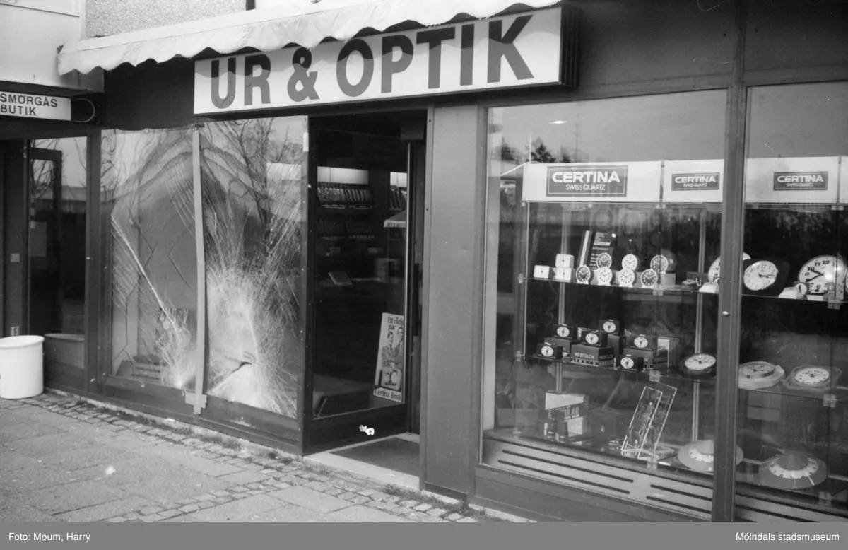 Inbrottsdrabbad ur- och optikaffär i Lindome centrum, år 1983. "Skyltfönstren krossades i Lindome-butiken då bilen backade in i dem."