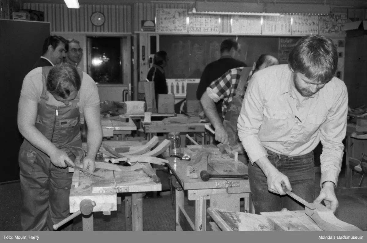 Tillverkning av lindomestolar i en av Ekenskolans slöjdsalar. Kållered, år 1985. "Stolsmakarna går helt in i sitt arbete."