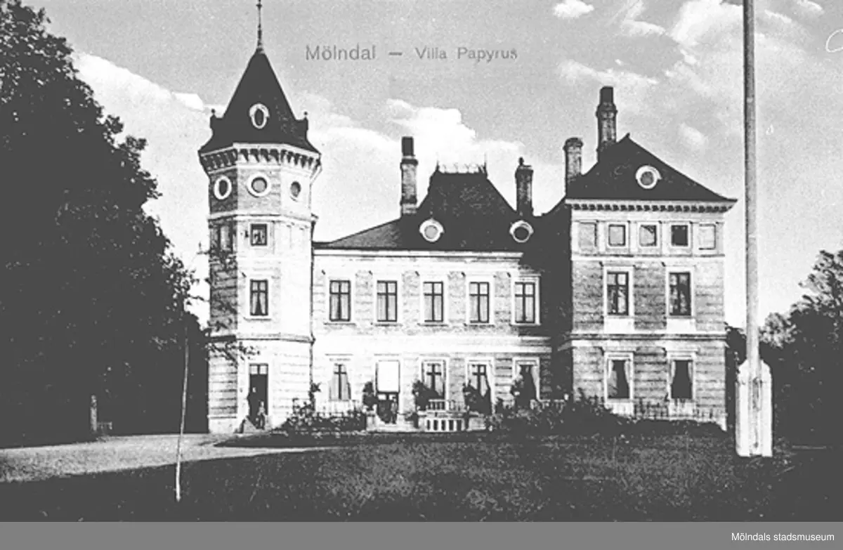 Vykort "Mölndal - Villa Papyrus" postat 8/7 1918. Byggnaden sedd från väster, innan 1915 års tillbyggnad.