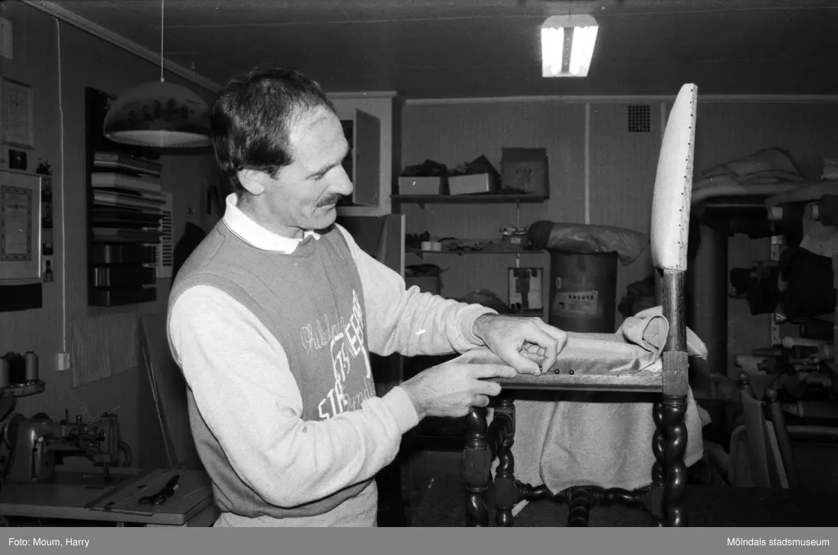 Lindome Tapetserarverkstad vid Spårhagavägen i Lindome, år 1985. "Lars Fagerberg i färd med att klä om en stol."