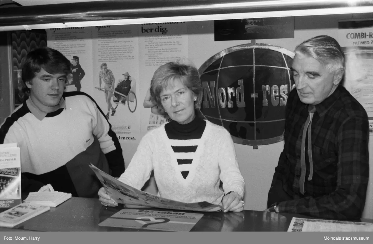 Resebyrån Nord-Resor på Frälsegårdsgatan i Mölndal, år 1984. "Familjen Ewlind, sonen Per-Anders, fru Maj-Britt och Carl-Ryno, planerar en resa."