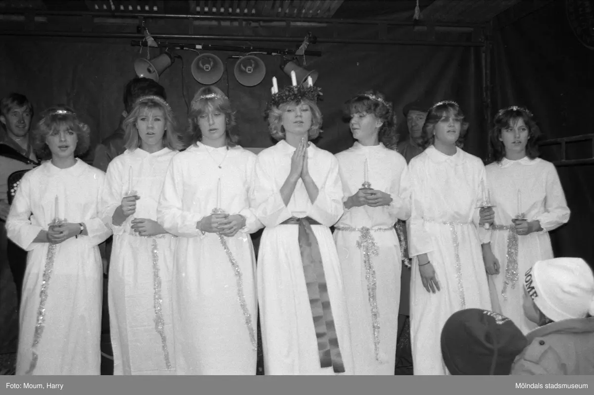 Julmarknad i Lindome centrum, år 1984. "Lindomes luciatrupp 1984 vid kröningen på torget."