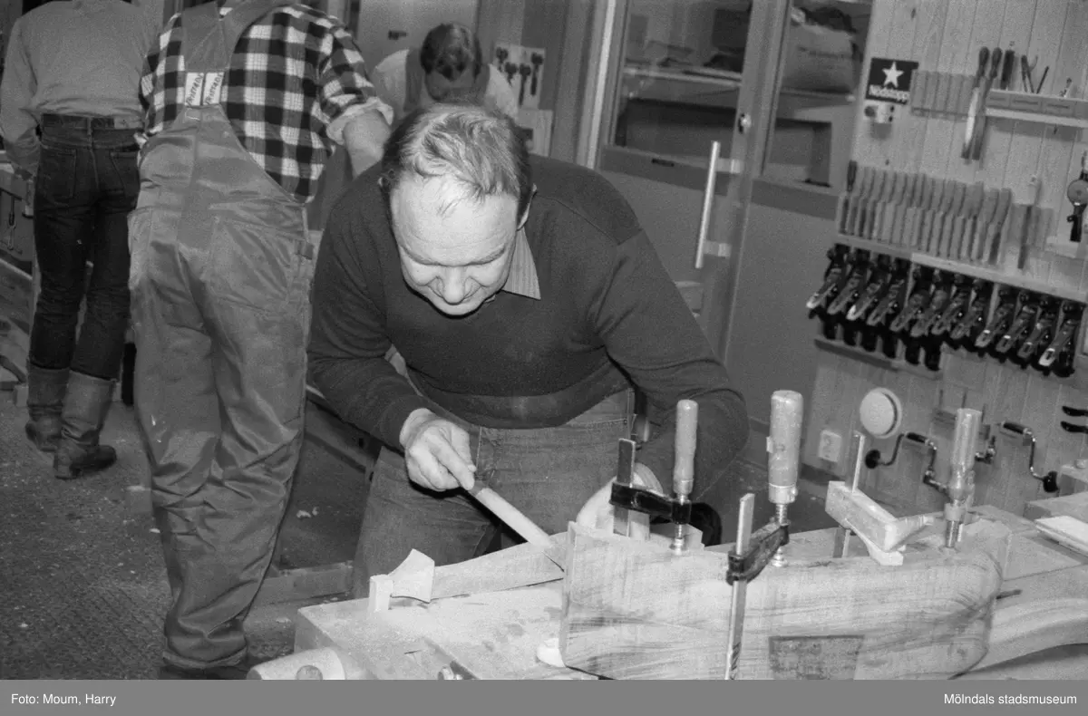 Tillverkning av lindomestolar i en av Ekenskolans slöjdsalar. Kållered, år 1985.