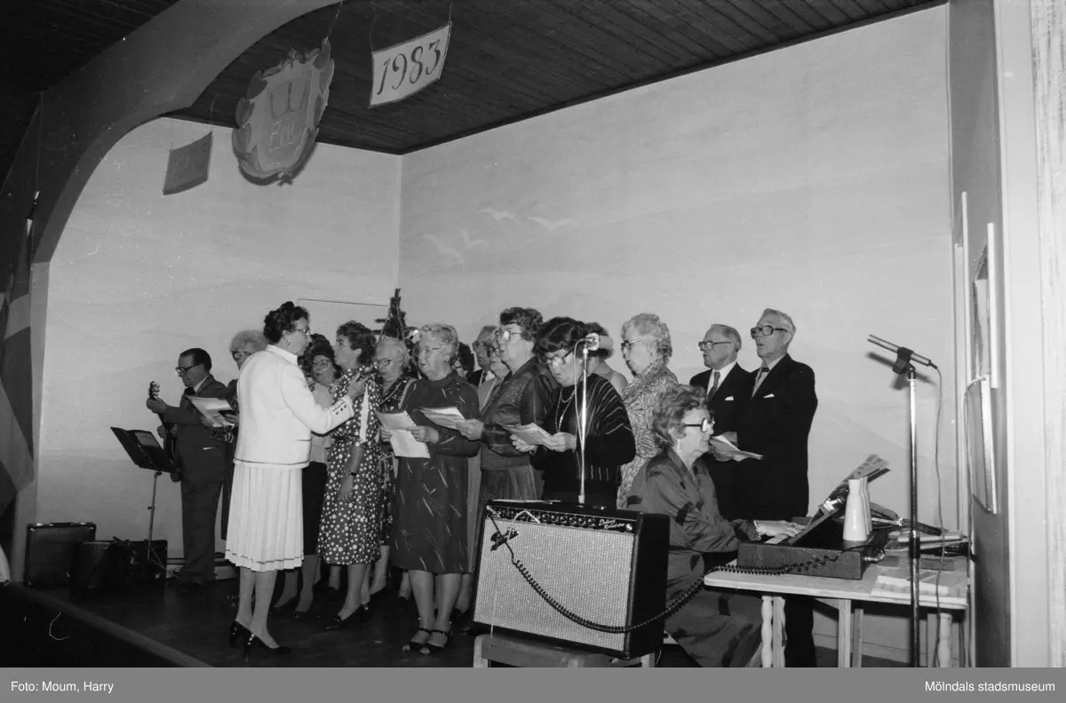 Pensionärsföreningen Lindome PRO firar 10-årsjubileum på Hällesåkersgården i Lindome, år 1983. "Den egna kören under Märit Åshammars ledning underhöll på jubileumet. Vid honnörsbordet satt de inbjudna gästerna."