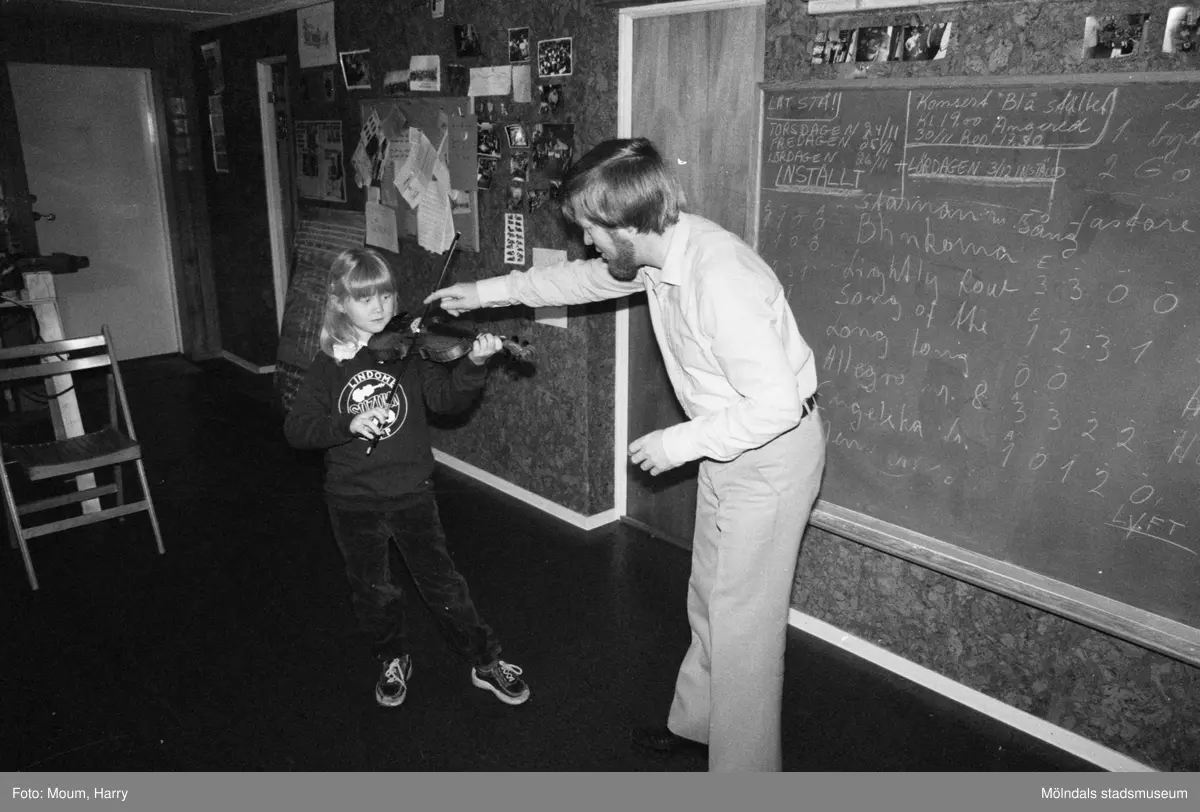 Carlo Hansen, Lindome, lär barn att spela violin enligt Suzuki-metoden, år 1983. 6½-åriga Madelene Christensen tillsammans med läraren Carlo Hansen.