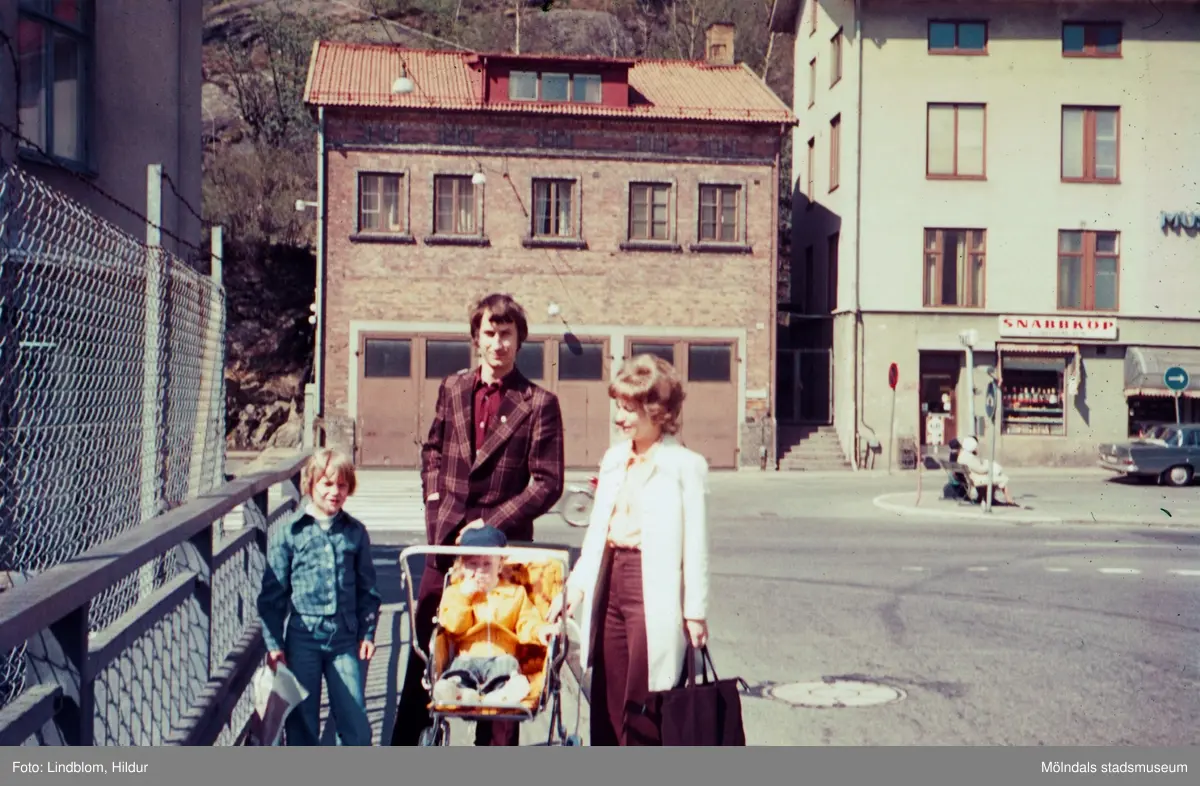 En kvinna, en man och två barn, det ena i barnvagn, står på Forsebron i Mölndal, 1970-tal. I bakgrunden till vänster ses del av gaveln till huset Kvarnbygatan 4. I mitten ses Kvarnbygatan 41, tidigare brandstation och garage för polisbilar, numera Mölndals målarskola. Till höger ses del av huset Kvarnbygatan 43, tidigare Mölndals stadshus, sedermera musikskola.