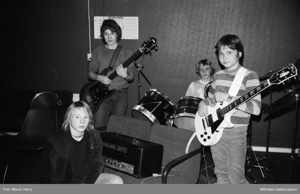 Rockband repar i lokal i Kållereds centrum, år 1983. "Kålleredsgrabbarna Michael, Christian, Folke och Christian (Daniel saknas på bilden) tränar för fullt, bland annat för att klara sig bra i popbandstävlingen på Almåsgården den 11 mars."