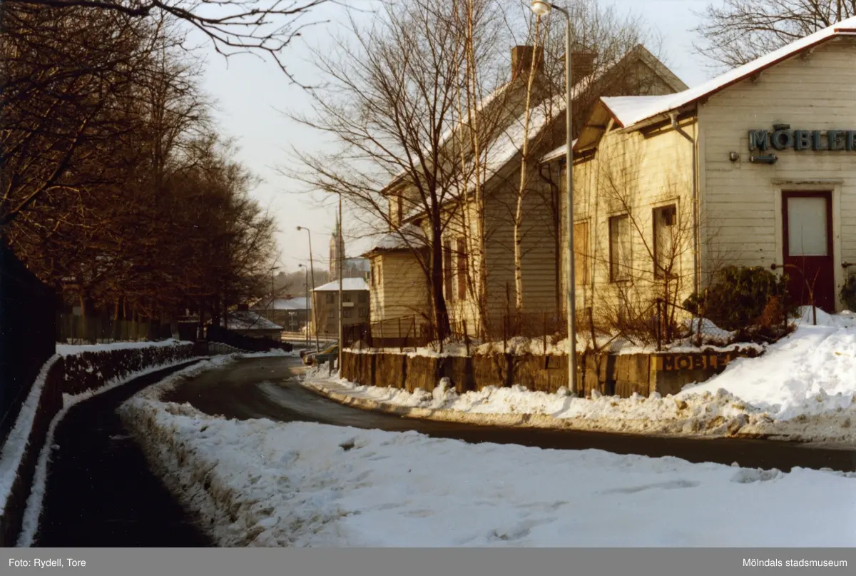 Gamla Kvarnbygatan i Mölndals Kvarnby på 1970-talet. Möbelaffären närmast till höger har nr 21, Frälsningsarméns hus lite längre ner på gatan har nr 19.