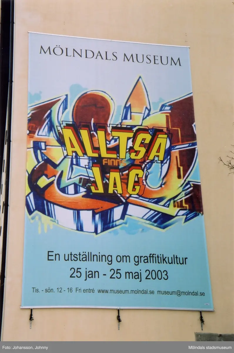 "Alltså finns jag". En utställning om graffitikultur som pågick 25 januari - 25 maj 2003 på Mölndals Museum (senare Mölndals stadsmuseum). Produktionen var ett samarbete mellan Mölndals Museum, Vitlycke museum, Bohusläns museum, Västergötlands museum och Konstkonsulenterna i Västra Götalandsregionen. Relaterade motiv: 2007_0198 - 0219.
