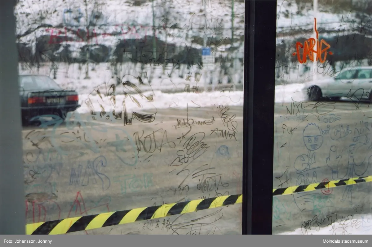 Klotter på en fönsterruta. Från utställningen "Alltså finns jag" som handlade om graffitikultur. Pågick 25 januari - 25 maj 2003 på Mölndals Museum (senare Mölndals stadsmuseum). Produktionen var ett samarbete mellan Mölndals Museum, Vitlycke museum, Bohusläns museum, Västergötlands museum och Konstkonsulenterna i Västra Götalandsregionen.