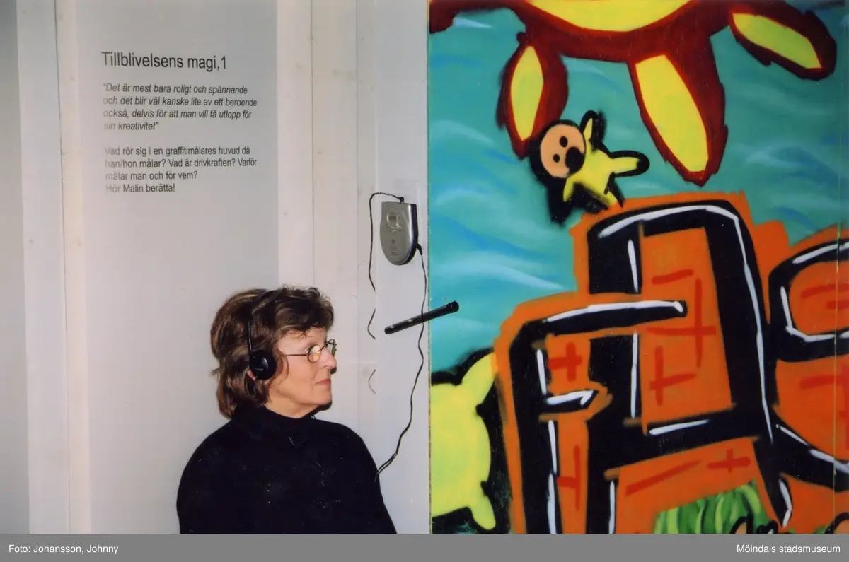 Birgitta Johansson lyssnar med hörlurar i utställningen "Alltså finns jag" på Mölndals museum, år 2003.