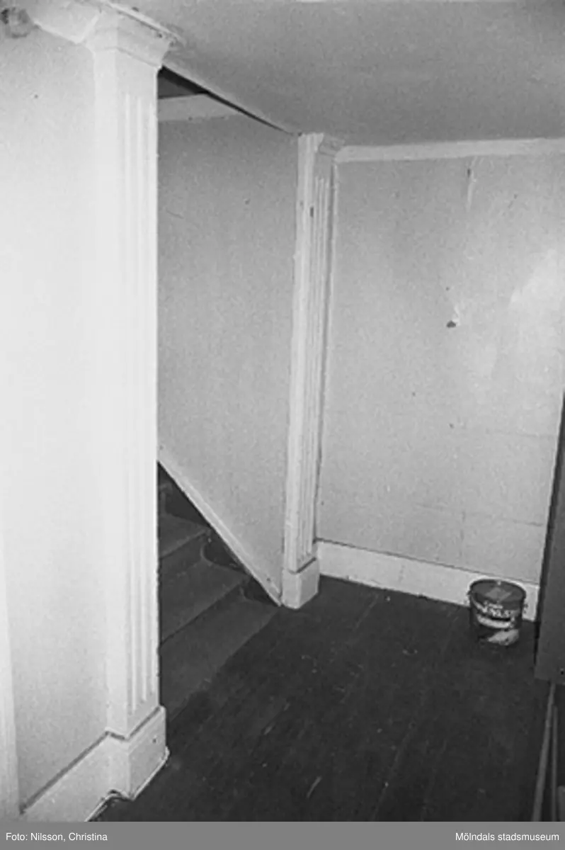Kvarnfallet 31, röda huset, G-3, hösten 1994. Interiör från Röda husets undervåning. Bilden visar del av förstugan och trappan till övervåningen. Ornerade pilastrar var vanligt förekommande inom den s.k schweizerstilen som i Sverige uppfattades som urnordisk och därför gärna efterliknades i arkitekturen. Man trodde att stilens former uttalade ett nordiskt arv vilket eftersöktes under 1800-talet. En dörr har tidigare funnits för trappuppgången.