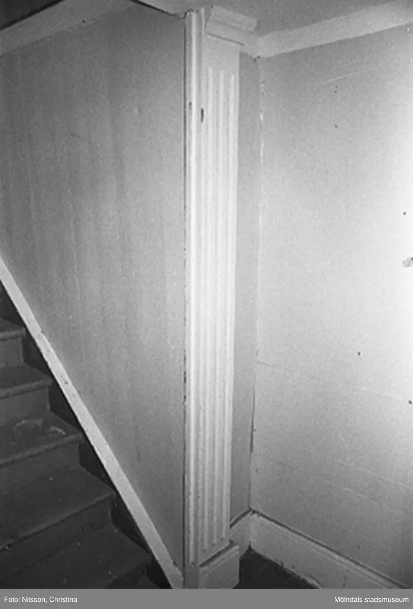 Titel: Kvarnfallet 31, röda huset, G-3, hösten 1994. Interiör från Röda husets undervåning. Bilden visar del av förstugan och trappan till övervåningen. Ornerade pilastrar var vanligt förekommande inom den s.k schweizerstilen som i Sverige uppfattades som urnordisk och därför gärna efterliknades i arkitekturen. Man trodde att stilens former uttalade ett nordiskt arv vilket eftersöktes under 1800-talet. En dörr har tidigare funnits för trappuppgången.