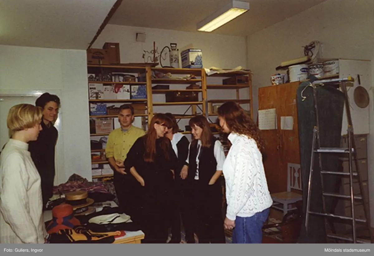 Ungdomar från Burgårdens gymnasium som ska visa baddräkts modet från förr, på Mölndals museum, familjesöndagen den 25 oktober 1992.