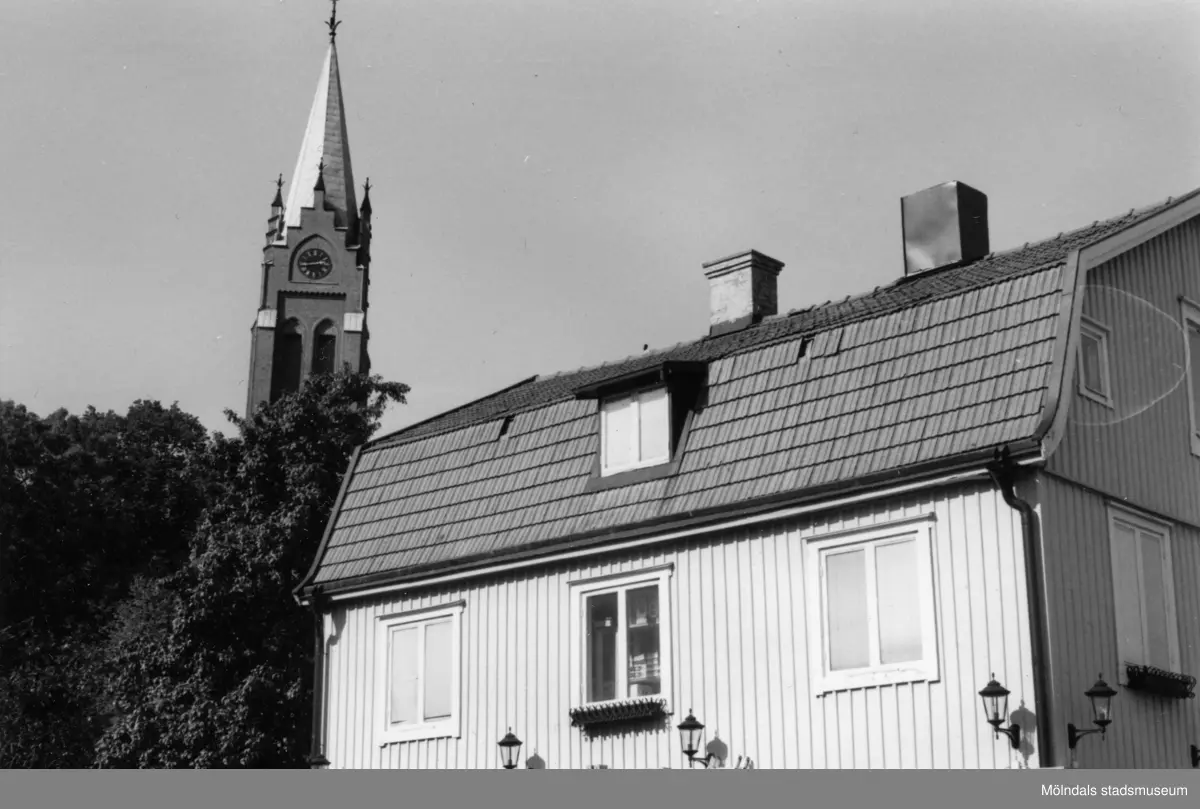 Joel Jacobsons järnhandel vid Frölundagatan i Mölndal, okänt årtal. I bakgrunden ses Fässbergs kyrka. Relaterade motiv: 2004_1302 - 1305.