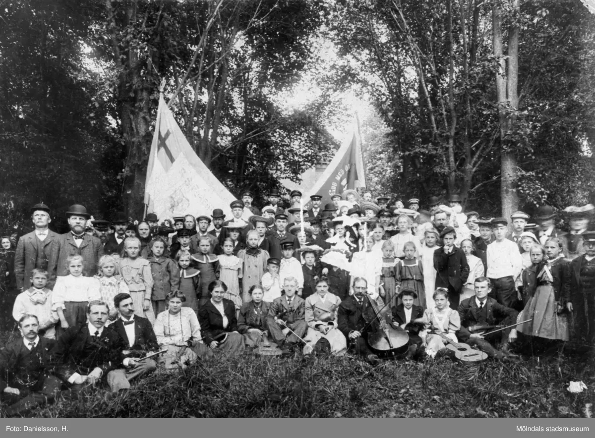 Man ser Blå bandsföreningen, Mölndal ute i det fria, år 1910. Stående från vänster i tredje raden; nr 2: Gräfsnäsen Andersson, vaktmästare på Eiser. Sittande från vänster i första raden; nr 5: Hildur Feuk (Göteborg), nr 6: Ellen Andersson (Göteborg). I bakgrunden skymtar troligtvis Mölndals sjukstuga på Forsåkersgatan (senare polishus och museum).