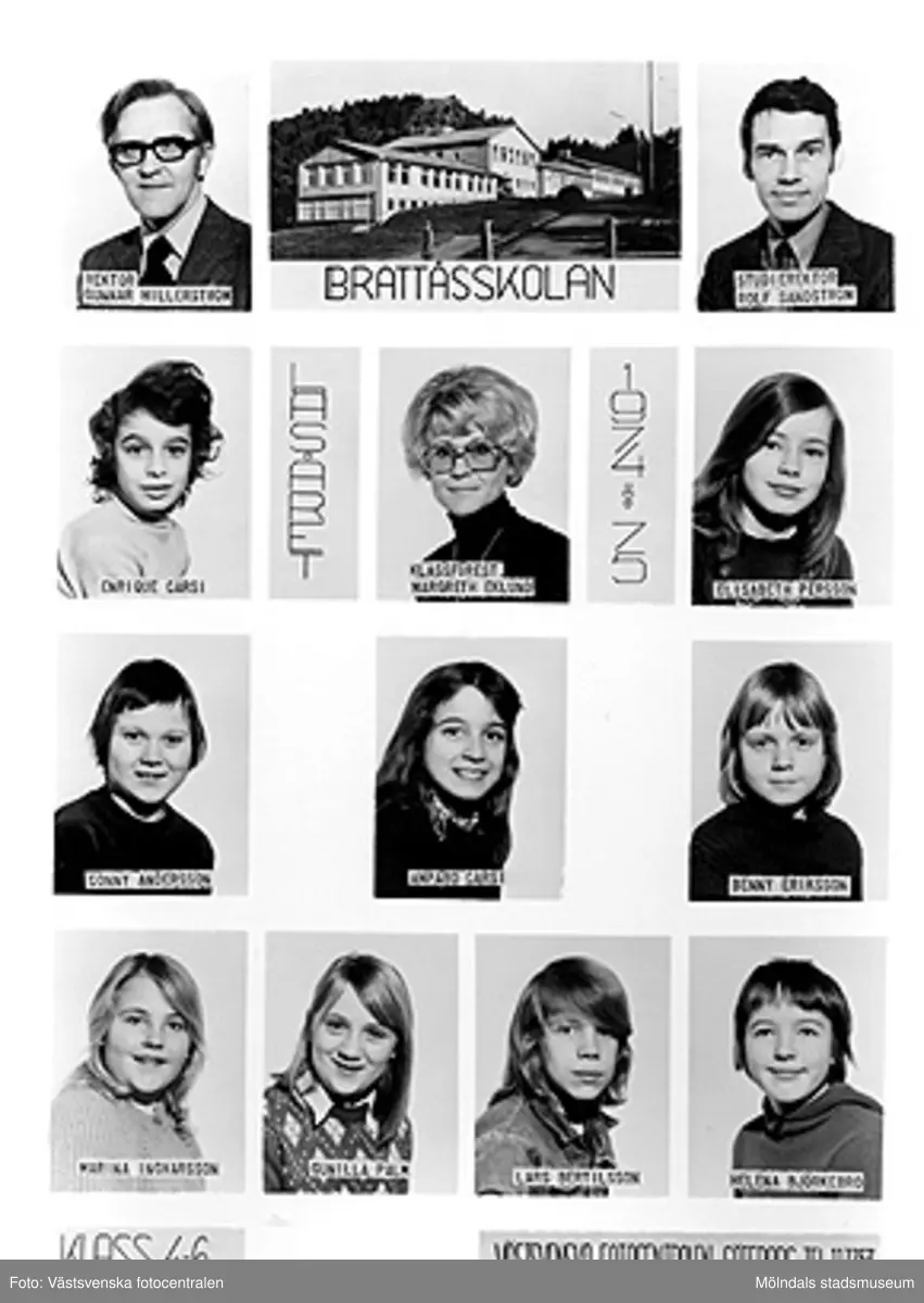 En bildkarta med skolfoton på klass 4-6 i Brattåsskolan, läsåret 1974/1975. Bildkartan är uppklistrad på ett fotoark i en pärm (MM23916) från Brattås rektorsområde, tillsammans med andra skolfoton MMF2004_1484-1522.