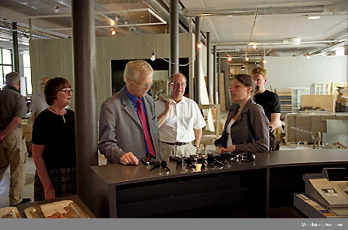 Finansminister Bosse Ringholm besöker Mölndals nya museum på Kvarnbygatan 12, strax innan museets invigning sommaren 2002. Med på bild finns museichef Mari-Louise Olsson, Ralf Lorentzon och Charlotte Hultén.
