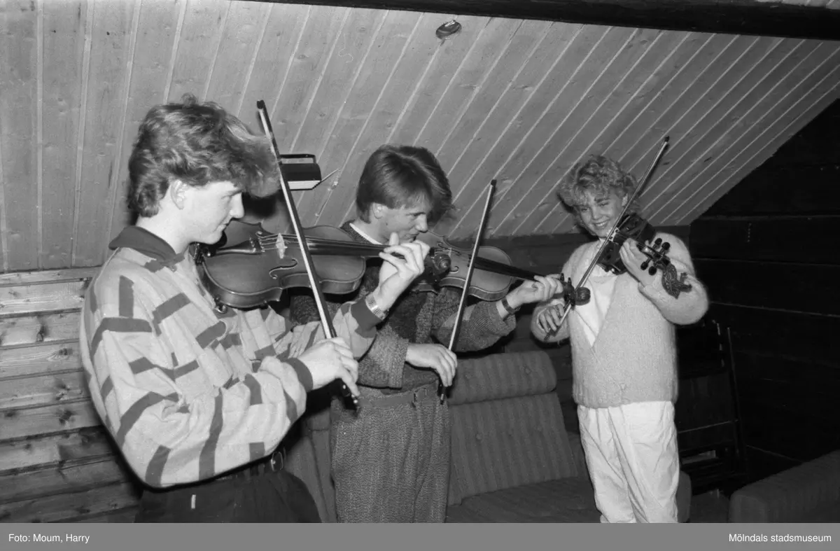 Ungdomar spelar violin i ABF-stugan i Lindome, år 1985. "Ungdomarna Peter Sandin, Jonas Persson och Sofia Johansson tycker det är kul i ABF-stugan under måndagskvällarna."