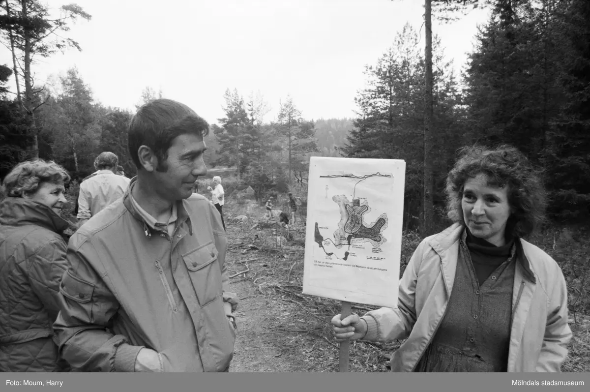Vandring vid Mattjärn med Lindome hembygdsgille, år 1984. Kajsa Karlsson håller en skylt.