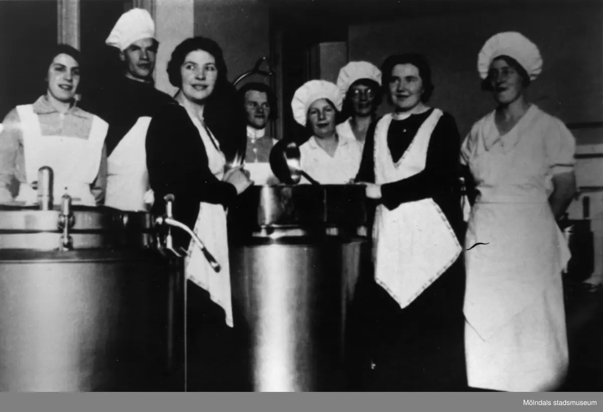 Köket i stora skolan på Streteredshemmet i Kållered. Signe Abrahamsson Vommedal, Ester Hermansson, A-son, Rut Lindström/Englund, okänd, Märta Sund, Sally Johansson, Karin-Linnéa.