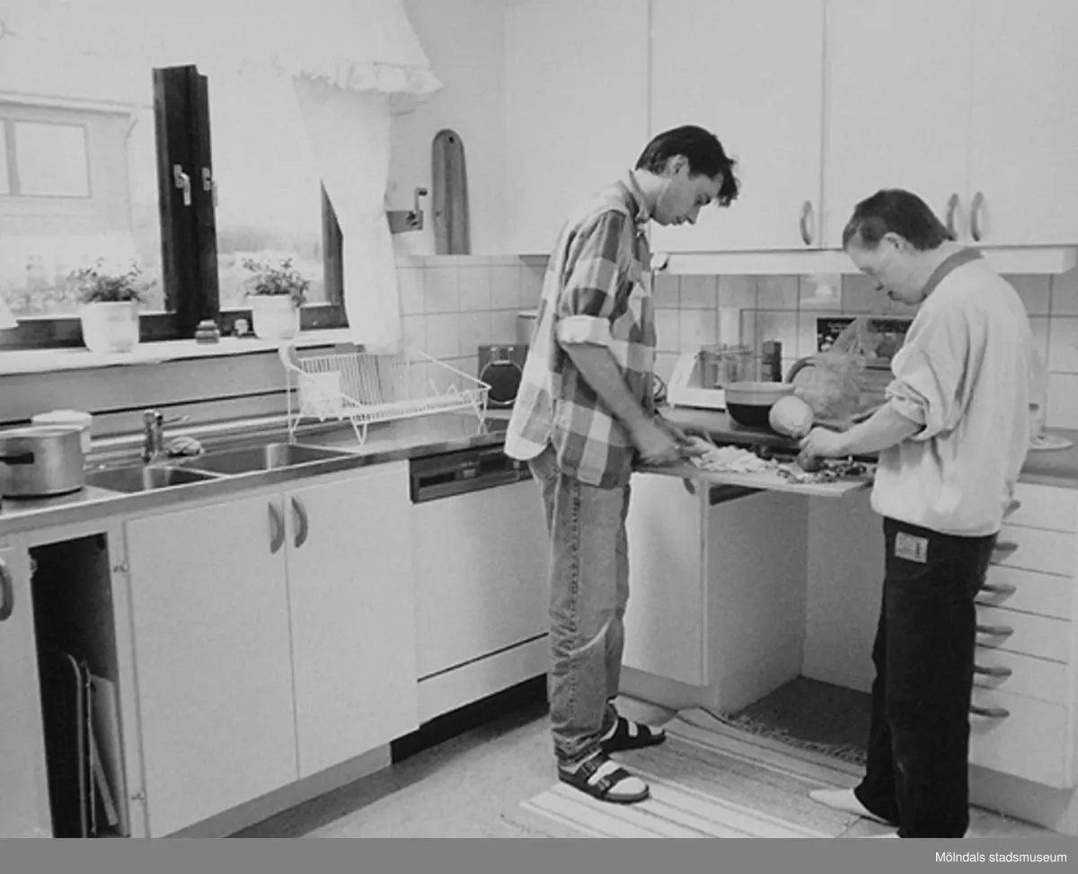 Två män står i ett kök och lagar mat