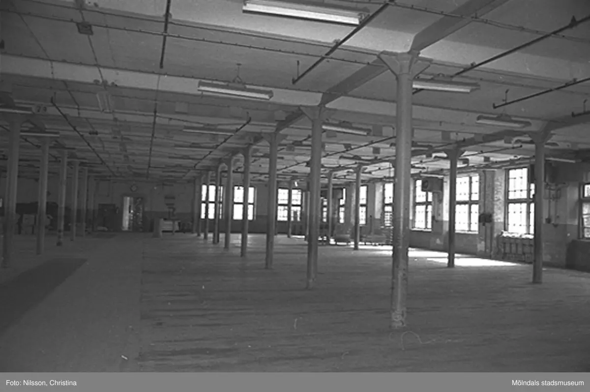 Byggnadsdetaljer: En stor sal med pelare och fönster i August Werners fabriker i Lindome, hösten 1994.