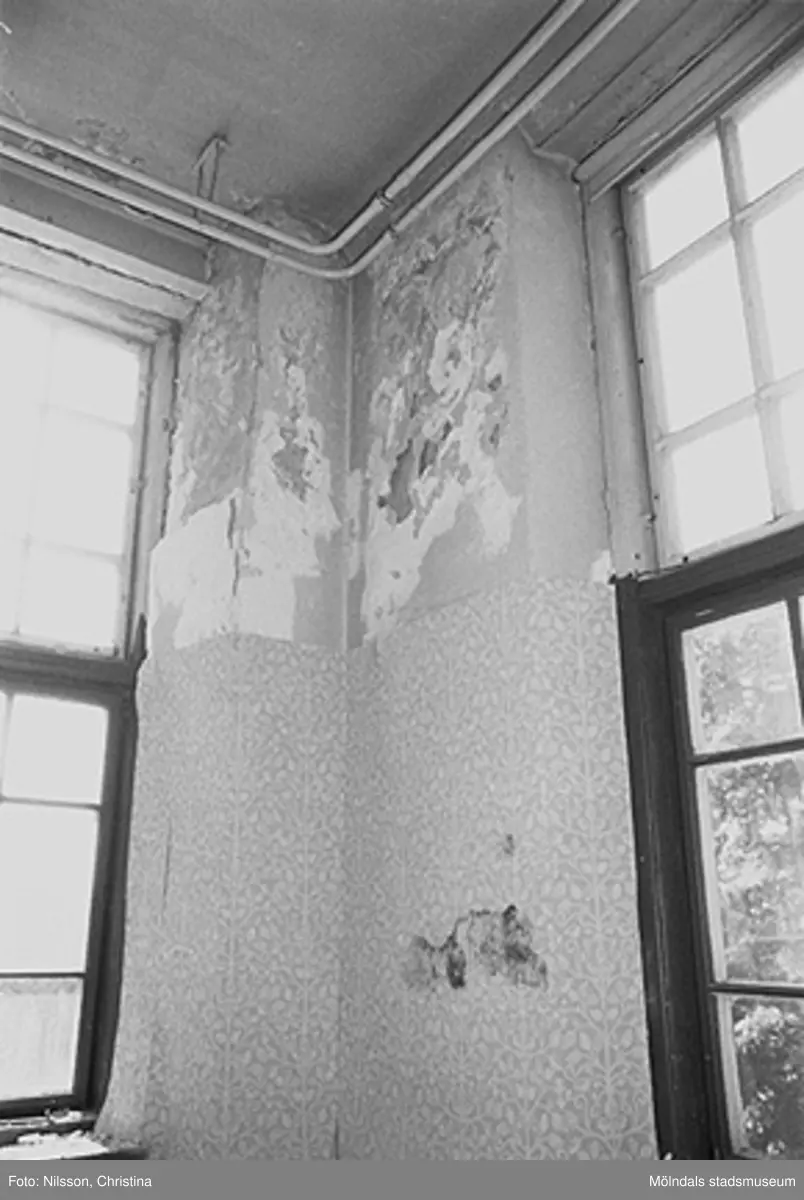 Byggnadsdetaljer: Skadad vägg, vattenledning och fönster i August Werners fabriker i Lindome, hösten 1994.
