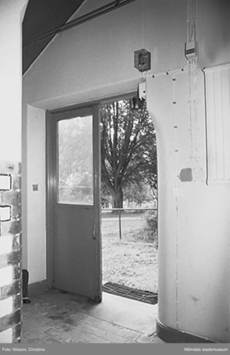 Byggnadsdetaljer: Ytterdörr. Det finns en elinstallation vid sidan om dörren. August Werners fabriker i Lindome. Hösten 1994.